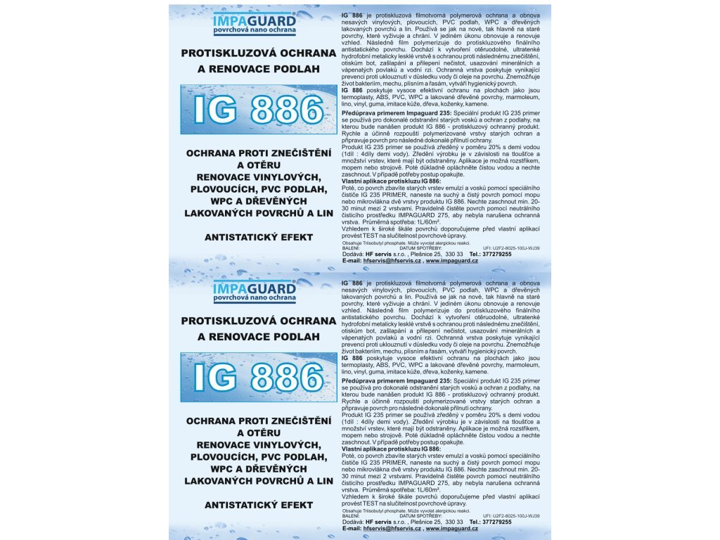 Impaguard Protiskluzová ochrana podlah je filmotvorná polymerová nano ochrana určená pro nesavé podlahoviny jako PVC, vinyl, linoleum a plovoucí podlahy. Oživuje vzhled podlahy a zároveň vytváří ochrannou vrstvu, která zabraňuje uklouznutí, usazování nečistot a vytváření minerálních povlaků.